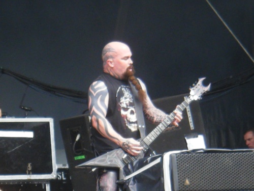 On ne sera pas plus bouleversés par les tronches faussement patibulaires de Slayer, déjà vus et qui ne nous ont jamais particulièrement marqués sur scène malgré quelques très bons titres. Monter un mur de 36 amplis Marshall pour en brancher finalement 4 et ne même pas broyer les oreilles des auditeurs, c'était bien la peine ! Certes le groupe a de loin, le guitariste le plus effrayant du monde (Kerry King), mais le chanteur est bien trop souriant pour inspirer la même peur - ça casse tout l'effet ! Et puis on pourrait parier que même ce fameux guitariste est doux comme un agneau : il semble en effet évident que personne n'est JAMAIS venu l'emmerder de toute sa vie... Bref, leur set est pétaradant et bien exécuté, mais un peu répétitif pour le profane : notre groupe se scinde puisque certains ont pris la sage décision d'aller faire le plein de pizzas et de bières sous la grande tente. On en ressortira que pour entendre finir le groupe sur Raining Blood, ça tombe bien, c'est notre préférée...