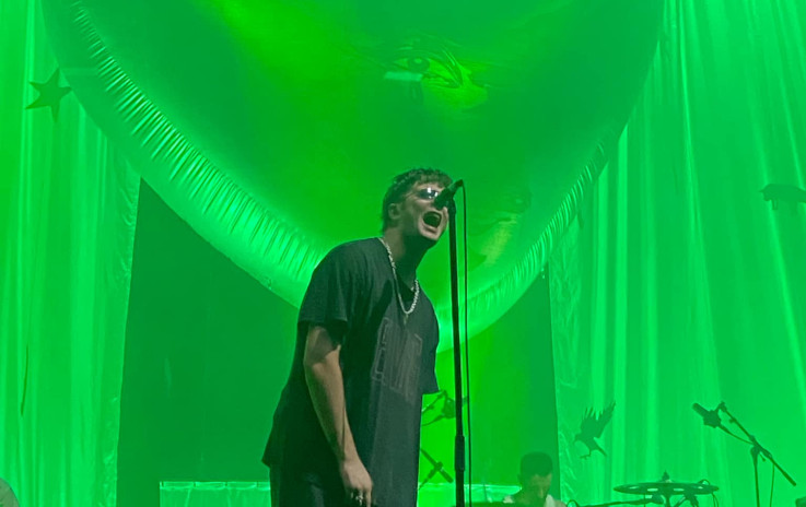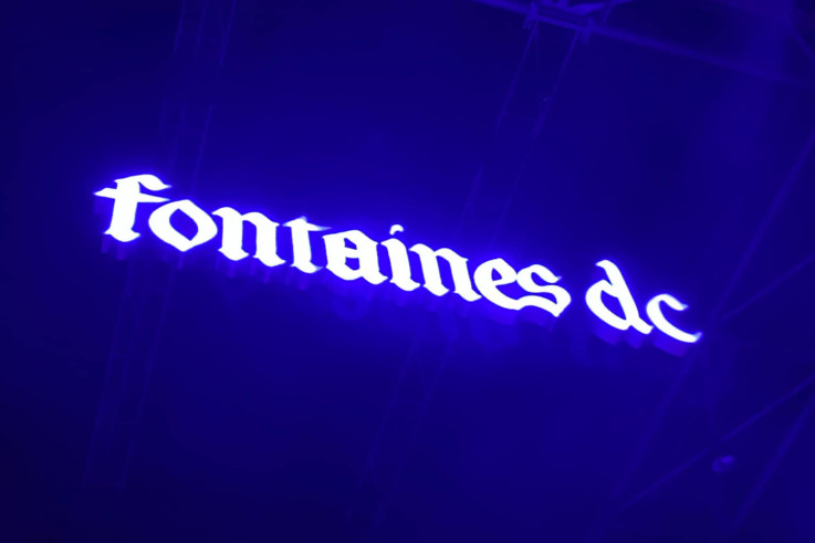 La 1ère partie est passée, sans que nous y assistions pour les raisons évoquées plus tôt, nous nous frayons un chemin à travers la foule pour nous approcher au plus près de la scène. C'est par "Romance" que s'ouvre le show, derrière un immense rideau éclairé de vert. Le groupe joue durant 2 minutes 30 en ombres chinoises avant que le rideau ne tombe pour découvrir la scène. La scénographie est Pop à l'image de l'iconographie de l'album. Un énorme coeur gonflé à l'hélium placé au fond de la scène, change de couleur au grès des lumières, alors qu'une immense enseigne lumineuse reprenant le nom du groupe est suspendue au-dessus de la scène. Le light show est soigné, offrant de jolis contrastes comme sur "Death Kink" où l'enseigne Fontaines D.C. s'éclairant d'un rose vif vient trancher avec le bleu électrique qui baigne l'ensemble de la scène.
