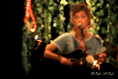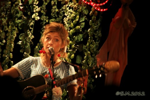 Seule sur scène, la guitare à la main, Giedré donne déjà le ton par son look (boucle d'oreille cerise, robe vichy et tampon dans les cheveux!!!) et le décor qui l'entoure (verdure et poupée gonflable, la bouche bien en cur!!!!). Tout chez elle contraste : entre la pureté, la naïveté de l'enfance et la noirceur, les horreurs de ce monde.