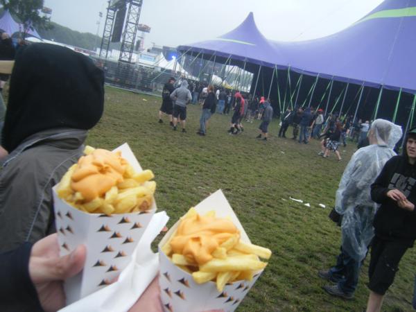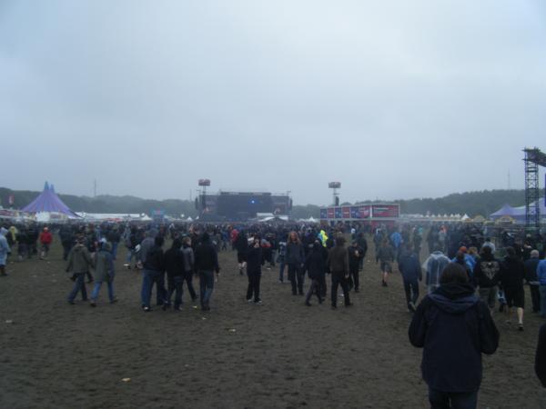 La Flandre n'est en effet pas plus que la Suisse, connue pour avoir la météo la plus ensoleillée d'Europe, on le constate dès le pied posé... Cela étant, l'expérience sera limitée ici à 1 jours sur les 3, parce qu'on a ni le temps ni le courage de passer 3 jours entiers à écouter du metal, entouré de bêtes sauvages au dialecte horriblement dissonnant, et que même notre résistance aux frites est limitée ! Il semble, d'après nos amis déjà sur place qu'on ait rien raté de génial la veille, mis à part une franche rigolade et un concours de air guitar d'anthologie devant les inénarrables (et ridicules, c'est confirmé) Scorpions, qui ont hélas zappé leur kitschissime et flatulant "vent du changement"...