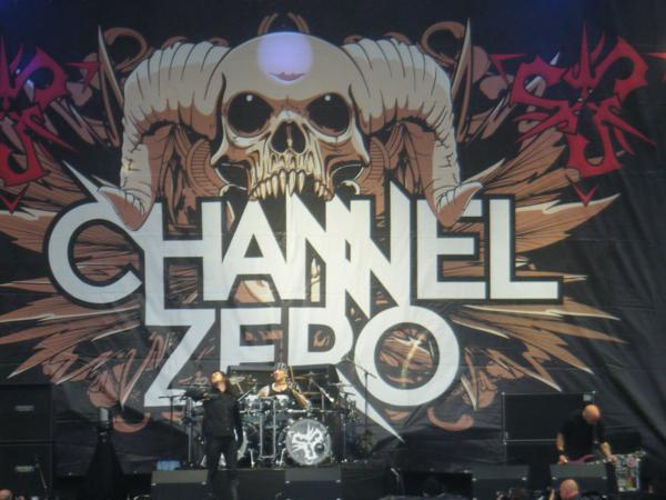 C'est donc l'heure du groupe belge qui passait opportunément par là (puisqu'Ozzy a officiellement annulé il y a deux heures à peine) et a pu débarquer à l'improviste avec 3 camions de matos et sa bannière de 10 mètres de haut, pour rallonger la sauce de la grande scène au pied levé : Channel Zero. Ces bons garçons sont en tout cas tout à fait à leur place : bon look (bottes en cuire et tête de méchant), bon son, le chanteur roule par contre comiquement les "r" dans son anglais, ce qui s'explique par ses origines flamandophones. Fuck the Government, climax du concert, doit être dédiée à leur pays, la Belgique, qui n'en a pas depuis plus d'un an et ne semble pas s'en porter tellement plus mal !