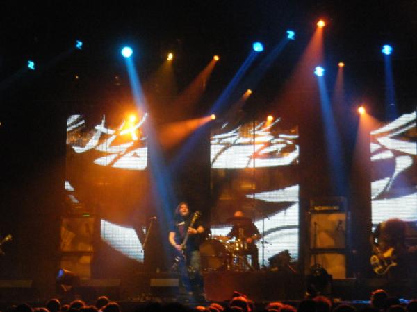 Car c'est que pile à la même heure, hélas, jouent dans la pièce à côté les Monster Magnet, grosses références du stoner (jamais vus en live) : il y a beaucoup moins de monde et pourtant c'est excellent : enfin un son qui n'est pas totalement white trash, mais qui a su conserver une part de blues ! Ca évoque bien sûr les Kyuss/QOTSA and co, sans esbroufe, mais avec une voix incisive, des riffs en plomb fondu et des fans globalement hystériques : c'est puissant sans être bruyant (pas mal de groupes de ce jour pourraient en prendre note !), à revoir sans faute en salle !