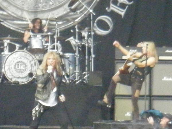Ici, il s'agit donc de heavy metal old school, sonique et mélodique, grave et aigu, le son est parfait et le show carré. Pour notre part, la fatigue aidant, on sentira quand même bien passer deux heures complètes d'un répertoire quasi inconnu, surtout en recevant à intervalles réguliers des projections de bière d'origine également inconnue. Sauf erreur, le chanteur a quand même un prompteur pour interpréter les titres les plus anciens ! Sur Breaking the Law, il ne chante pas du tout, le public assure la voix dans une belle bronca ! Et puis, bien sûr, climax, l'énorme tube Painkillers que même les ignares dans mon genre connaissent ! Passage paraît-il obligé, l'arrivée en moto, dans l'un des trois rappels (ouch !), et le concert se finit... avec un peu de soulagement quand même !