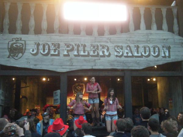 Pendant ce temps-là, au "Joe Piler Saloon" (ach ! quel suptil cheu de mots, avec le nom de la pière lokhale !), des jeunes filles en tenues de cowboy légères dansent sur le comptoir, et s'amusent à agacer la libido de la population, masculine à bien 90 % comme toujours dans cette musique (à noter que les rares filles dans le metal, souvent très jolies, ont en plus parfois tendance à s'aimer entre elles !). Le tout sur de la musique, non pas metal mais FM teutonne : on se croirait un peu dans une station de ski autrichienne, à 15 heures quand les bars ouvrent au sommet des pistes... L'heure du hollandais en somme : c'est bien la même culture joviale et légèrement bourrine, à quelque chose près, que celle de nos amis flamands !