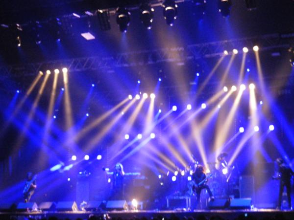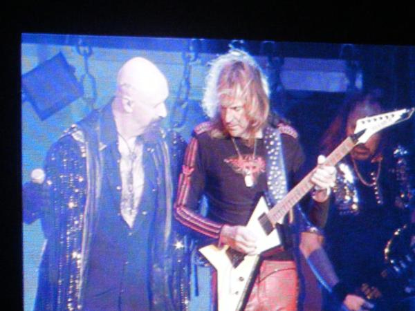 Bon, puisqu'Ozzy a fait place nette, on nous a annoncé qu'on aurait droit (quelle chance non ? non ?) à 2 heures complètes de Judas Priest, avec show laser ! Sur ce point, passons vite, comme sur la pyrotechnie : deux-trois effets deci-delà, mais sans grand intérêt. Par contre, s'il y a bien un mec âgé qui a la classe dans le metal, c'est Rob Halford, qui tourne pourtant depuis 40 ans et le début de la "first" wave of british heavy metal. Elegant avec juste ce qu'il faut de déguisements, la voix presque intacte, avec un groupe impeccable, le Prêtre et ses sbires vont faire le show et feuilleter leur discographie avec gourmandise, pour le plus grand plaisir du public, dont pas mal de gens connaissent l'ensemble des paroles et des gimmicks !