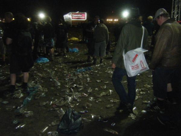 On peut encore glander un moment sur le site et échanger sur les mérites comparés de la douzaine de groupes qui nous ont ramoné les écoutilles toute la journée, avant de gagner la sortie en marchant dans un océan (assez rétrograde, pour le coup) de gobelets plastiques. Il faut dire que la prime aux ramasseurs (1 verre offert pour 24 rapportés) semble vraiment trop élevée ! Le camping, très bien organisé et tenu, s'étale sur une longueur infinie, mais on arrivera à y dormir pas trop mal, une fois endormis nos voisins les plus braillards (et avant qu'ils remettent une sono metal, de bon matin...). Au moins les flamands ne nous ont-ils pas trucidé dans notre sommeil pour nous bouffer tout crus, comme on le craignait vaguement...