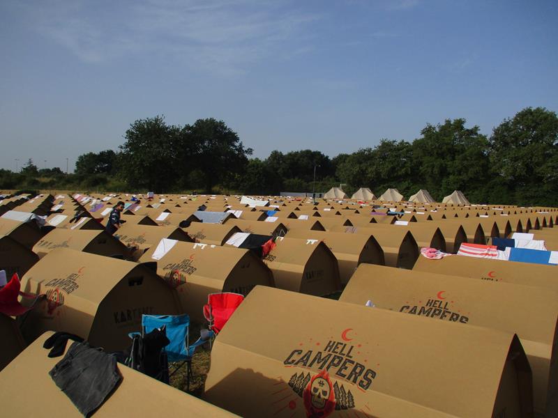 Reste que quand votre âge commence par un 4 (et plus pour si longtemps que ça, d'ailleurs), que vous avez eu 3 trains à prendre dont un Ouigo-mon-c... (bagages ultra-limités donc !), que votre amoureuse (certes badass) pèse largement moins de 60 kilos, cette solution est fort pratique, en diminuant vos bagages d'une bonne moitié en poids, et de 2/3 en volume ! Accueil très sympa des bénévoles, jolie petite tente en carton comme prévu, lit de camp/duvet/kit hygiène/chaises pliantes/lampe fournis, on sent qu'on va être très bien ici... puisqu'en plus, c'est connu, à ce jour il n'a jamais vraiment plu au Hellfest (NB : cette affirmation a hélas été démentie le week-end suivant, qui semble avoir été bien humide et même froid !)