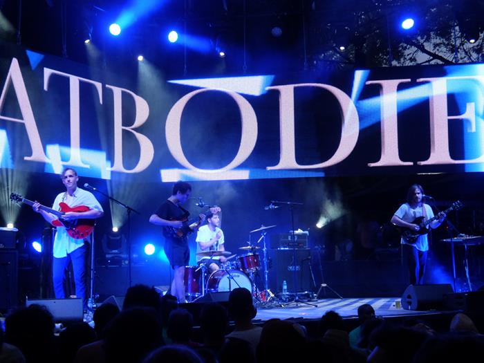 Ah ! Voilà un grand petit groupe de heavy rock garage ricain qu'on a déjà eu l'occasion d'applaudir à Marseille : les 4 affreux jojos au nom pléonasmique des Meatbodies ! Comme si un corps pouvait être fait d'autre chose que de viande... Selon la mode lancée il y a quelques années par John Dwyer, Saint-Patron du Rock Garage Psyché Cool from SF, les guitares et basses s'y portent volontiers collées sous l'aisselle (à l'exception notable du leader Chad Ubovich, quand même, à l'aspect plus grunge old school). En parlant de Saint Patron, on sait que ledit Ubovich a déjà joué de la basse sur scène avec Ty Segall (en robe, et en adhérant à l'abominable mode des claquettes-chaussettes bien avant l'heure) : après une entrée calme en trompe-l'oeil, il développe donc avec ses sbires un fabuleux raffut, marqué au fer rouge par ces deux ombres tutélaires bienveillantes, en réussissant à y apporter une petite touche personnelle quand même. Vestimentairement, ça pique un peu moins les yeux qu'en hiver (où les 4 étaient en jogging remonté au dessus du nombril...)
