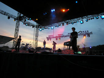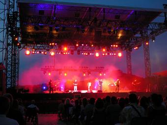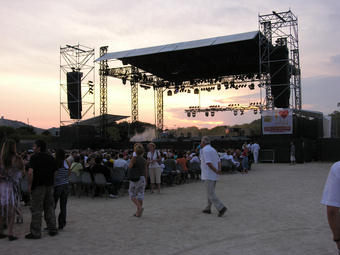 Le moins qu'on puisse dire est que l'on n'a pas été déçu. En effet, la météo est venue parachever cette soirée du 15 Juillet : vent nul, température idéale, coucher de soleil magique derrière la scène venu comme un cadeau de bienvenue du littoral varois à la formation de la si voisine île de beauté... Sans compter une installation du public très bien pensée avec un grand rectangle de chaises à plat devançant un gradin, le tout quasi plein...