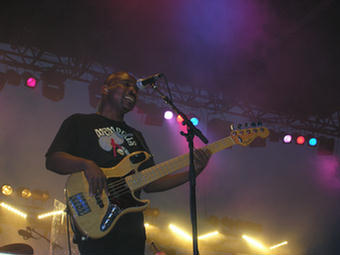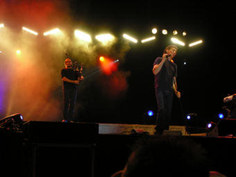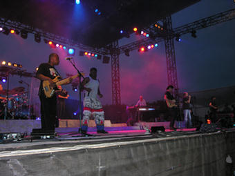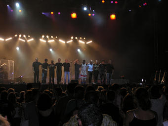 Le premier moment de surprise passé, on s'intéresse de plus près à la formation qui évolue devant nous. Décidément, I Muvrini, il faut le dire et le redire pour tordre le coup aux clichés, ça n'est pas que des polyphonies corses. Oui bien sûr ils chantent en corse et parfois ils mettent la main sur l'oreille... Mais il y a autre chose, peut-être d'ailleurs décrié par les puristes, qui fait que cette musique dépasse le pur folklore pour s'ouvrir sur le monde et les gens. Le groupe pratique et promeut depuis de nombreuses années le mélange des genres et adapte la polyphonie aux sons actuels. Pour ne parler que des deux derniers opus, on avait vu passer des churs basques et des chants afghans dans l'album Umani de 2002, avec en prime des invités de marque comme MC Solaar, Stephan Eicher ou Luz Casal. Dans le dernier album, Alma , enregistré à Johannesburg, ce sont des churs zoulous, de la cornemuse celtique, du violon tzigane... Les frères Bernardini et leur équipe pratiquent une world music épanouie, curieuse et avide d'ailleurs : tout ce qu'on aime.