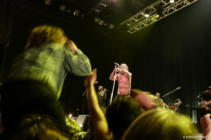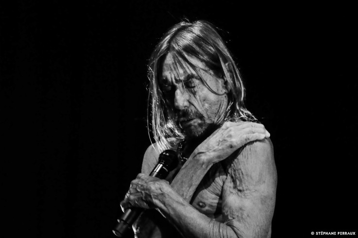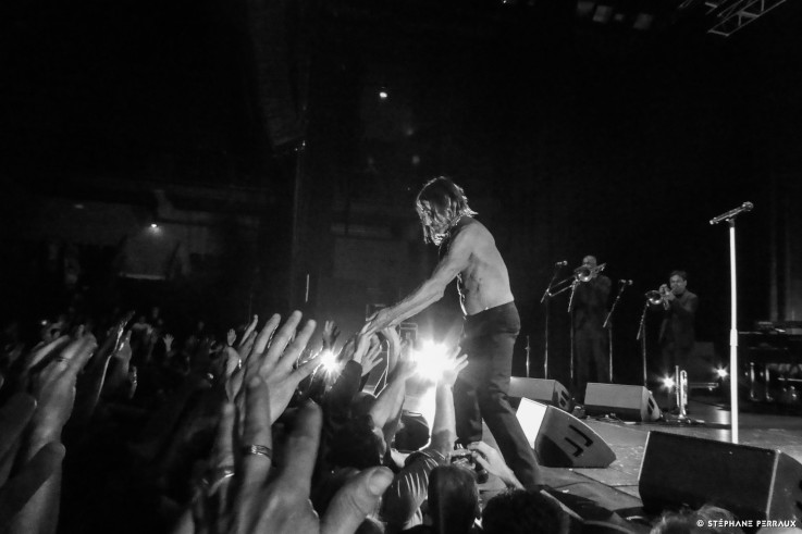 Puis arrivent "Loves Missing", "T.V. Eye" et "The Endless Sea", le public est en feu, le chant est clair et puissant. Avec "Lust for Life", "The Passenger" et "Gimme Danger" qui déboulent, Iggy tombe la veste. Il semble impossible alors de contenir les plus fougueux qui les uns après les autres montent sur scène pour un petit moment de gloire ou juste pour un stage diving, ils sont rapidement rattrapés par la sécurité et renvoyés dans la mêlée. Impossible de ne pas chanter en chur de tels monuments du punk rock. Le show est passionnant, la joie est aussi irrépressible que communicative. Iggy bondit à gauche et à droite comme un kangourou fou, tourbillonnant au-delà de tout entendement, tapant dans les mains des chanceux spectateurs des premiers rangs. L'âge ne semble pas avoir de prise sur lui. Sa présence scénique est d'un magnétisme unique, il occulte l'ensemble de la scène, qui semble trop petite à présent...
