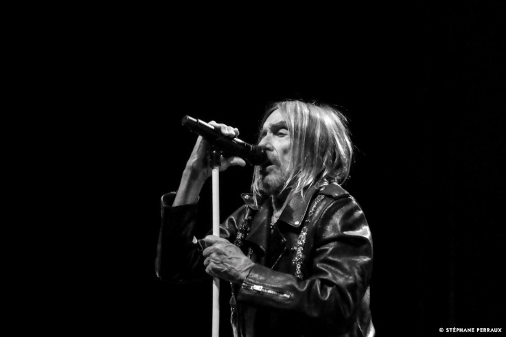 À 75 ans, plus que jamais charismatique et d'une classe infinie, notre papy adoré est visiblement toujours près à brûler les planches en véritable showman. Le spectacle va commencer dans un décor minimaliste, la salle bondée en configuration assise est prête à accueillir l'Iguane sur scène. Les six musiciens entrent en piste et entament l'intro alors que sur le voilage de fond de scène d'anciennes images live monochromes défilent. Avant que la silhouette mince d'iggy Pop ne bondisse enfin sur scène dans un costume Gucci, sobre et sombre, et torse nu forcément. Regard malicieux, narguant la foule, le jeune homme de soixante-quinze ans entame "Five Foot One". Les hurlements de joie fusent alors d'un geste de la main Iggy invite l'assemblée à se mettre debout. Sans se faire prier davantage un carrousel de cris, de sifflements, d'applaudissements et de sauts submerge Le Liberté. L'orchestration est rock, l'ambiance est là et c'est ce que nous attendions.