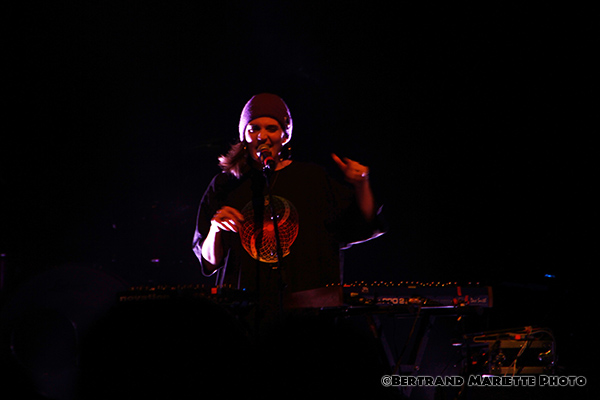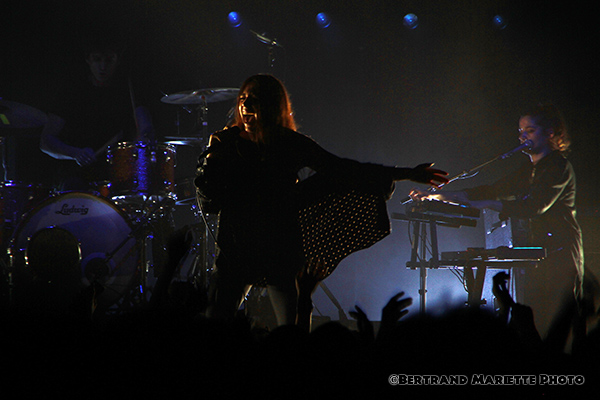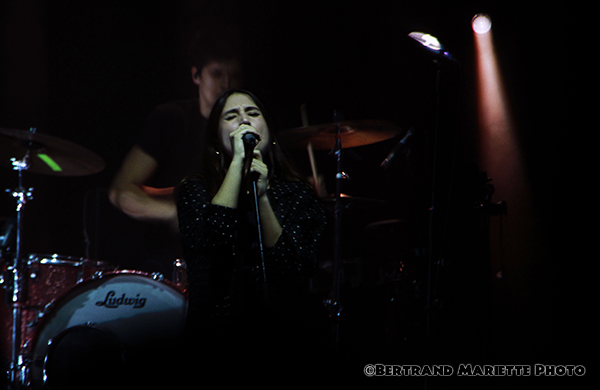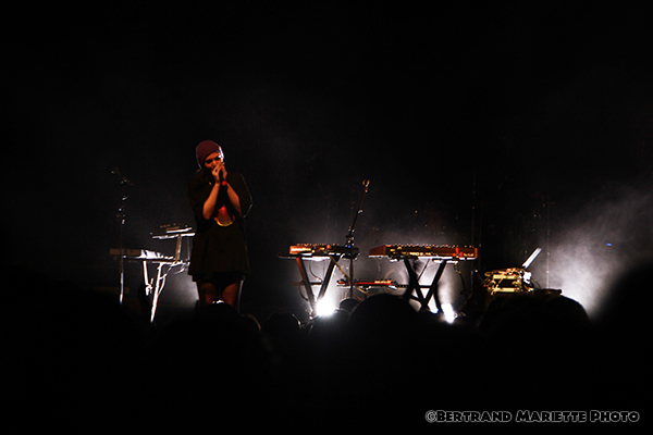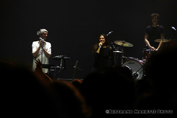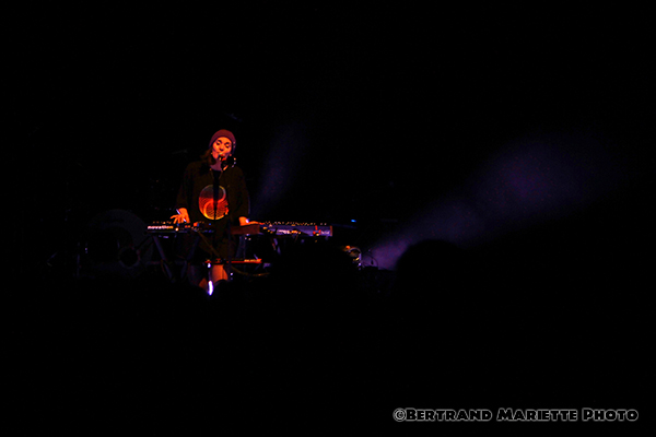 Chacun est positionné à un endroit et ne le quitte pas. Ils sont probablement très concentrés sur ce premier show. Mais pour avoir vu des concerts de la rockeuse précédemment, je ne m'attendais pas à cela ce soir. Ceci est possiblement dû également à une nouvelle formation musicale que ce que j'avais pu apprécier il y a quelques années, si je ne me trompe pas. Puis Izia se lance dans l'interprétation des titres Chevauchée et Esseulés initialement en featuring avec Jeanne Added et Dominque A. Avec le titre voluptueux Lullaby, le silence revient dans la salle, elle captive son public. Une sortie de scène très furtive de tous les artistes, laisse présager sans aucun doute un rappel, puisque les techniciens installent un synthé en plein milieu de la scène.