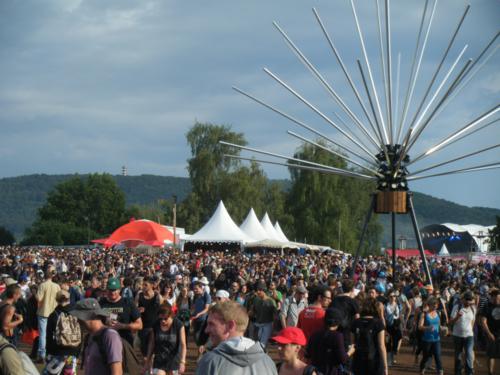 Et y retourner malgré tout, sur le Malsaucy, avec la même excitation teintée de légères angoisses météorologiques, entouré de kids dont les plus vieux (ceux qui étaient déjà nés...) salissaient leurs couches avec entrain en 1994, quand on y vint pour la première fois, se faire ramoner les écoutilles par Rage Against the Machine, entre autres. C'est se dire que cette année on est particulièrement insensible à la programmation (les têtes d'affiches ayant déjà été vues et revues, les découvertes nous laissant un peu de marbre, et le Festival de Beauregard nous ayant à nouveau piqué quelques beaux concerts). Mais que ça n'altère en rien le plaisir de s'élancer, une fois encore, sur la Presqu'Ile du Malsaucy d'Evette-Salbert, à l'assaut de l'été - en espérant qu'il y soit bien arrivé avant nous, l'été ! Il est néanmoins permis d'en douter en posant le pied à 12 h 27, en tenue légère et manifestement inappropriée, sur le quai trempé de la gare Belfort-Montbéliard TGV, sous une vilaine petite pluie froide...