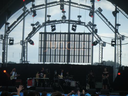 Un beau soleil enfin estival a fait son apparition sur la plage (de plus en plus arasée et donc plus accessible chaque année) quand on rejoint Jungle, combo de pop funky ultra-efficace composé de 5 musiciens et 2 choristes aux voix incendiaires, dignes de Twenty Feet From Stardom. Ca groove donc sévèrement dans les t-shirts, dans les maillots, au son de la basse salace et du clavier festif des deux chanteurs aux avant-postes (micros vintage en bonus), de percussions qui tapent dans les genoux comme le marteau du docteur, et de choeurs sexy en diable. Les titres sont de facture très classique mais on en redemande, en sautillant joyeusement. Dans le style, on avait pas revu de truc aussi bon depuis General Elektriks. Qui a dit que les blancs ne savaient pas groover ? Ben, Sharon Jones et ses potes des Daptones hier peut-être, mais on y était pas ! Voilà en tout cas qui nous a mis la banane... et la dalle en pente.