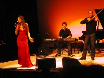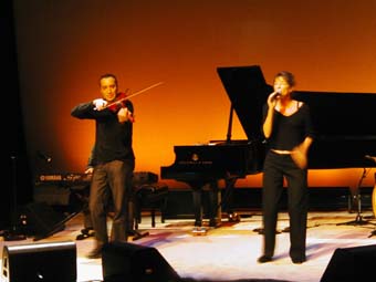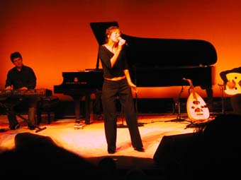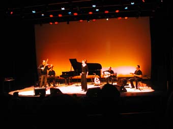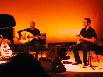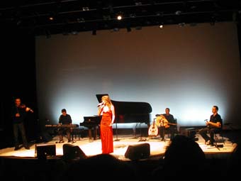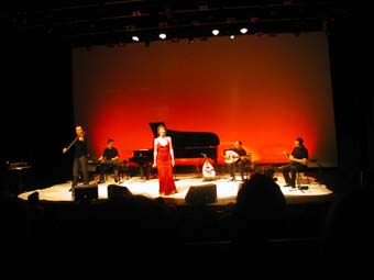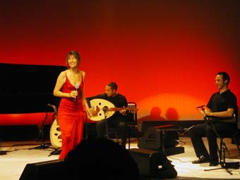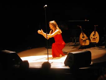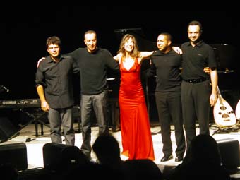 Sinon musicalement elle est aussi accompagnée sur scène de Djamel Benyelles au violon (et responsable de la plupart des arrangements de Arabesque), Amel Riahi El Mansouri au lute et Karim Nagi remplaçant au pied levé Aziz Boularoug (ce dernier n'ayant peut être pas eu le temps avant de venir de raquer les 15 dollars nécessaire a l'obtention d'un rendez vous a l'ambassade pour amener son dossier avec chronopost, le mandat cheque de 100 euros etc ...). J'ai parfois trouve que la derbouka sonnait un peu trop métallique mais bon ... si on considère qu'il est arrivé le matin même de Boston pour apprendre les morceaux ... pas mal !