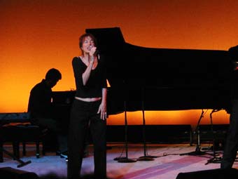 Elle est sobrement habillée en noir dans une tenue qui laisse apparaître le bas de son ventre. Cheveux attachés. Elle occupe l'espace (assez grand) en s'appuyant sur le piano lorsqu'elle ne chante pas, ou en venant s'asseoir au bord de la scène en chantant.