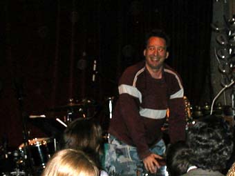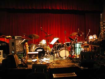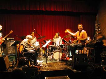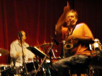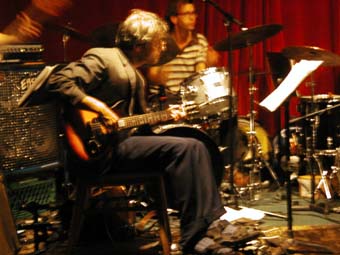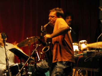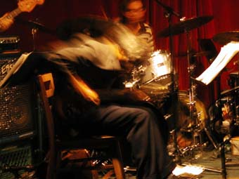 Parmi tous les musiciens j'ai surtout ete impressionne par Marc Ribot ... il faut le voir, vetu d'un pantalon en toile un peu use bleu marien, t shirt blanc, veste noir, chaussettes bleues et sandales en plastique, se tordant sur sa chaise et decrochant des soli tour a tour Pink Floydiens, bluesy voire metal, tout en rajustant ses lunettes de temps en temps ... Cyro Baptista plus sobre que quand je l'avais vu au Festival Mimi 2002 apporte des tas de sons bien sympas avec ses percus et ustensiles diverses. Les deux batteurs se completent bien ...