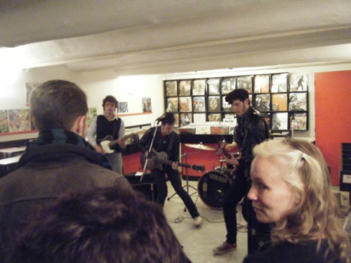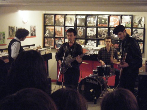 A l'occasion on constate aussi avec plaisir que ces jeunes gens à casquette sont courtois, du genre à vous remercier d'avoir pris 2 heures pour écrire une chronique sur eux. Pas ces vieux chnoques des Hatepinks qui auraient fait un truc pareil, et d'ailleurs je ne sais pas s'il faut s'en réjouir sur un plan existentiel (est-ce vraiment une attitude raisonnable pour un jeune con de poseur ?) Bref une fois la scène prête, les Jolis commencent un petit set nerveux, carré, efficace, sonique (quand on pense qu'à l'origine il était question de ne faire que des concerts unplugged dans ce magasin !).