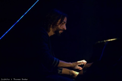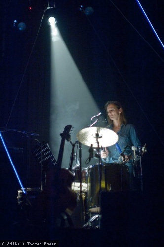 Lorsque les fils blanc/bleu s'illuminent et qu'entrent en scène les artistes, je les vois pénétrer un diamant. Au piano, Bertrand Flamain ouvre délicatement "la boîte à musique". Le piano permet davantage de ressentir le toucher du pianiste, ce petit je-ne-sais-quoi faisant toute la différence. Le chur (Skye, Nathalie Réaux, Claire Joseph et Diane Sorel) s'élève après les premiers mots de Katel, écho féminin, angélique. Voûtes se découpe en trois temps. Les basses (plus présentes aujourd'hui, elles équilibrent l'ensemble) viennent se déposer en nappes, puis au rythme d'un tom basse, s'amplifient. C'est Skye qui envoie l'énergie superbe qu'on lui connait à la batterie : avec elle, on se retrouve en terre lointaine où rythmes, danses et chants nous raccordent au sol et aux étoiles, mués par un élan sauvage, vital, primordial. C'est à l'animal en tous que Katel s'adresse comme le confirme Hors-foule. On se relie aisément à cet instant du choc amoureux, de la rencontre, où, hors du temps, l'on se trouve unis par un regard, au travers du miroir. Ces instants, perles de verre, sont miraculeux, un trésor pour l'âme, et ainsi que nous l'enseignent contes, pièces de théâtre et romans de tous temps, ils précipitent une transformation profonde afin que Belle et Bête puissent "vivre au dehors ". Nathalie Réaux et Claire Joseph accompagnent aussi aux claviers, venant enrichir par leur travail et fin ressenti les multiples strates de la composition. En écoutant Ralentis, je m'extasie sur la variété des différentes structures et le soin méticuleux porté aux détails, Katel ne se livre pas à la facilité : un pur régal. Elle cultive l'art des harmonies gracieuses, des crescendos, des ruptures de ton, des contrepoints et de la réponse, en pleine maîtrise de ses moyens.
