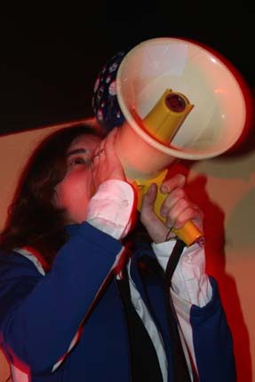 Et... Lapin Machin apparut. Je crois ne pas l'avoir encore préciser, Lapin Machin est un trio, deux garçons, une fille, Jo, Mikka et Violette. Il y a aussi une deuxième fille qui vient sur quelques titres derrière un clavier ou bien derrière un mégaphone. Je ne sais pas vraiment comment elle s'appelle. Evelyne, peut-être.