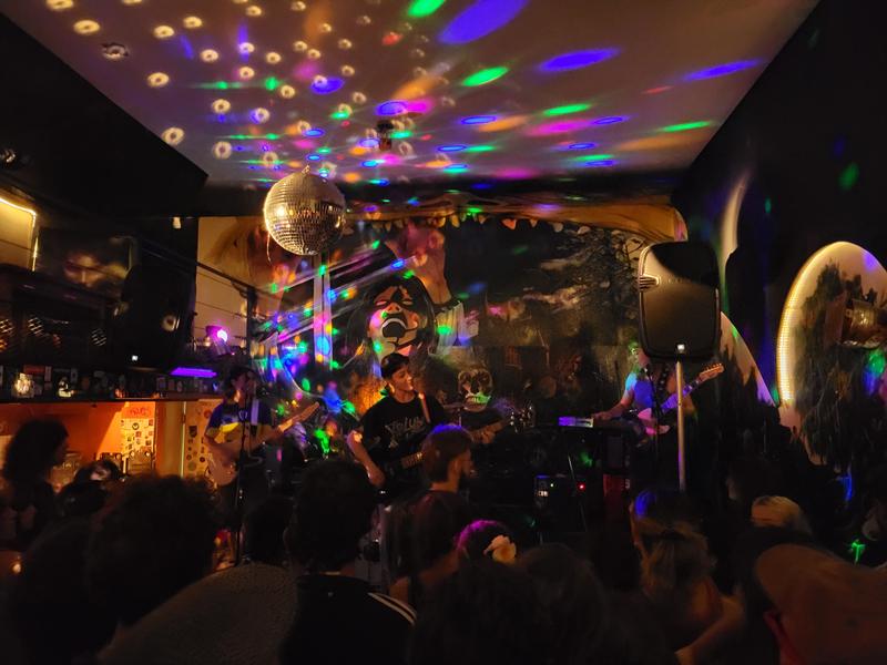 Au premier coup d'oeil, c'est bien plein dehors et dedans, population vingtenaire façon "terrasses de Jean Jaurès / tout le monde déteste la police"... Et particulièrement féminine à l'intérieur, sans doute parce que sur scène s'avancent Las Grimas, un trio entièrement féminin. Si le commentaire peut paraître bas-du-front a priori, force est de constater que le public se masculinisera pas mal pour le second trio, entièrement mâle. Eh oh, y'a pas de mal à amener ses propres supporters, ses copines et ses copains !