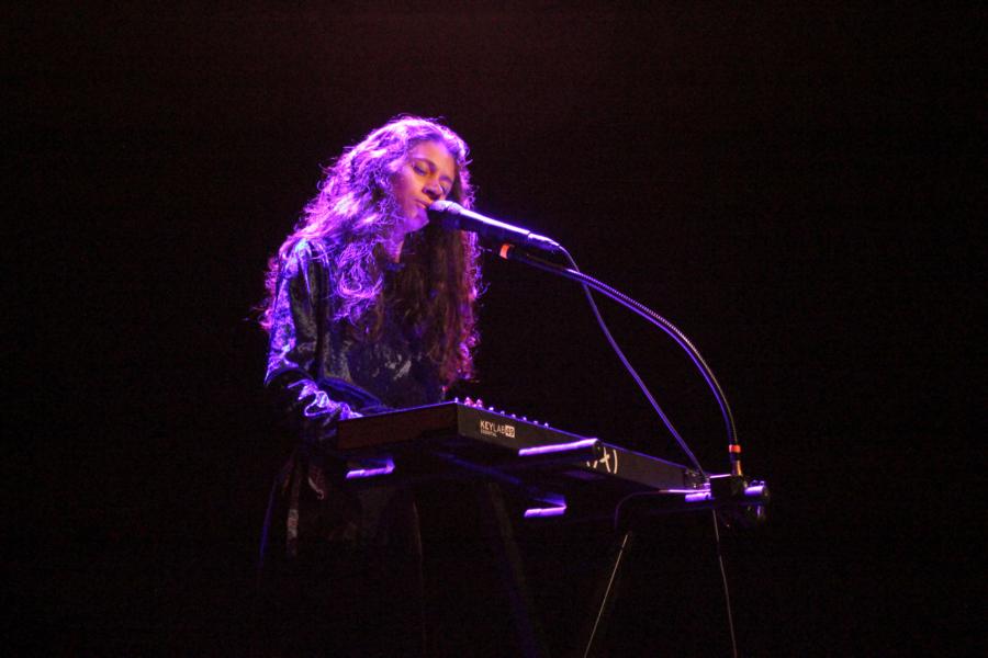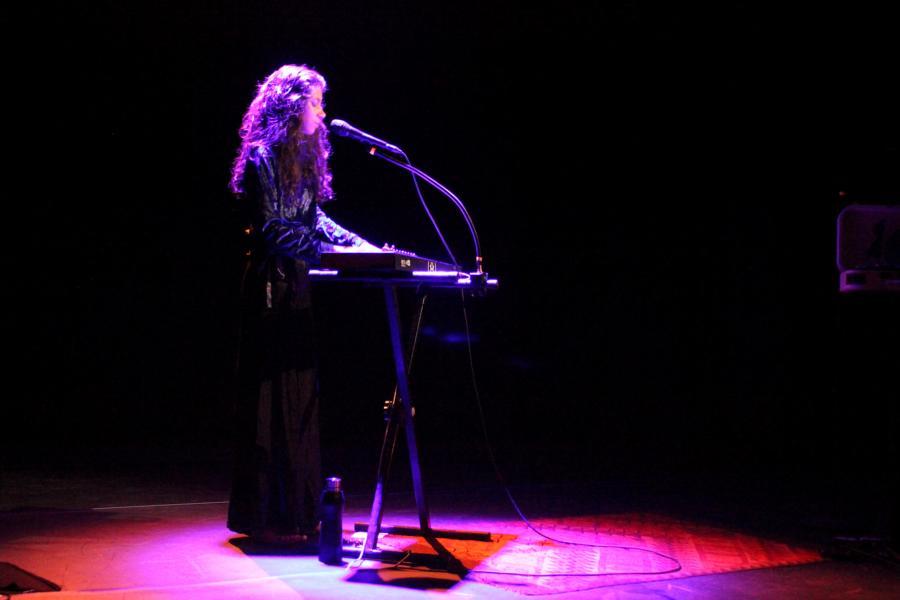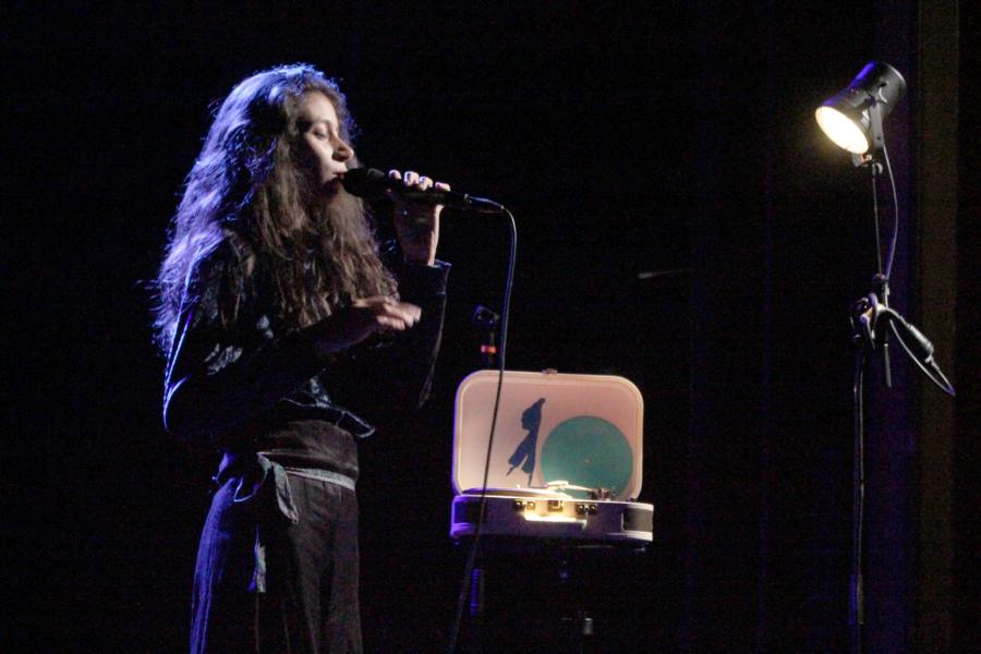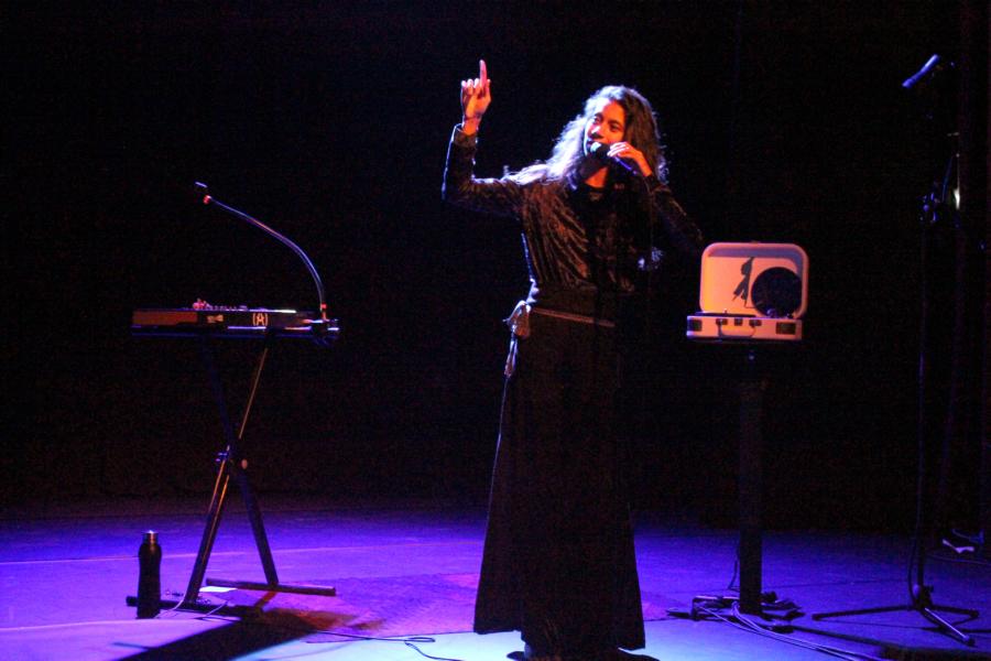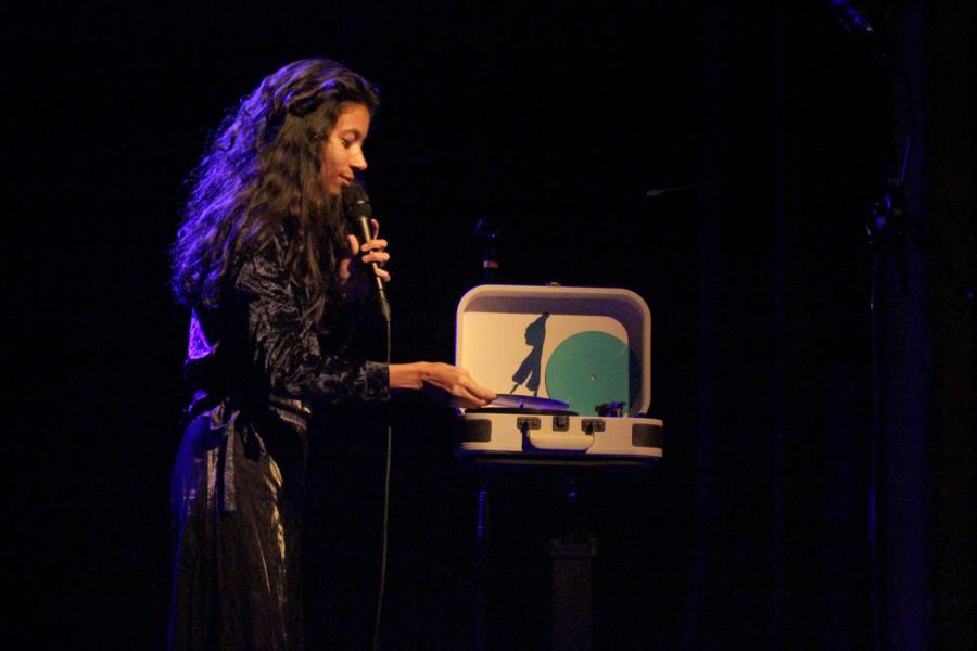 Le décorum du concert est des plus sobres, au centre le micro, à gauche un clavier et à droite une surprenante valise où sont jouées des vinyles avec ses versions instrumentales, qu'elle nomme avec malice "Appoline La Platine".