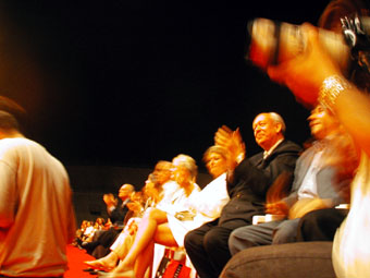 Après quelques morceaux où alterne Pavarotti et une chanteuse, on nous appelle : on récupère les appareil, fait le tour du stade et on se retrouve au pied de la scène sur le côté. Dernière recommandations : pas de flash, ne bouger pas trop pendant les chansons, si les gens rouspètent derrière vous abaissez vous, restez accroupis ...
