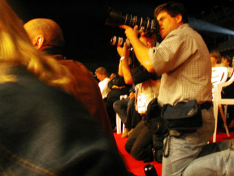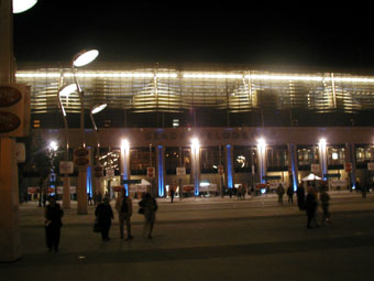 J'arrive à l'heure au rendez vous 22h30 entrée Gold. Un bonhomme bien sympathique et tout classe nous attend. On nous conduit à une consigne pour poser notre matériel (un Olympus C-200 en ce qui me concerne, mais pour les autres cela correspond à des sacs et valises avec des bêtes à XXXXX euros "plus cher que ton éducation" aura la finesse de penser tout haut un des photographes à propos d'une des filles de la consigne). On nous emmène ensuite voir un bout du concert avant de revenir nous chercher. Et c'est ainsi que je me retrouve à l'entracte dans la loge n°15 (celle de l'OM paraît il) c'est à dire en plein devant la scène situé devant les tribunes "gané" de l'autre côté du stade ... sans appareil pour vous montrer la belle vue. Champagne, sandwich, pizza, ... je souris intérieurement en pensant au prix qu'ont du payer les gens à côté ... mais bon pas trop à l'aise non plus.