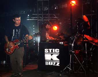 Nous nous sommes ensuite dirigé vers l'autre petite scène qui semblait plus nerveuse (des rythmes technos nous parvenaient). On est tombé sur STICKBUZZ qui m'ont carrément emballé. Sorte de techno rock à la Spicy Box guitare, basse batterie platines entrecoupés de morceaux plus rap (mais toujours aussi nerveux). L'idéal pour mettre en transe un public qui a envie de se défouler (quasiment de la musique de rave). Au chant le batteur et un peu aussi les autres.