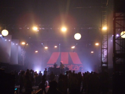 Hélas le temps des DJ sets est venu. Petit passage à la performance d'un inconnu : à une porte, un type me certifie que c'est John Lord Fonda, à une autre on me dit que c'est Matthew Herbert (ndP : je confirme).. il est vrai que rien ne ressemble autant à un DJ techno qu'un autre DJ techno... En tout cas celui-ci (appelons-le Mr X), propret dans sa chemisette et bien terne après Vitalic, fait un set pas trop mal, si l'on excepte ses visuels franchement moches, set que j'écoute d'une oreille distraite en papotant (c'est dingue le monde qu'on peut croiser à un festival électro et rock sur le J 4, ça n'arrête pas...).