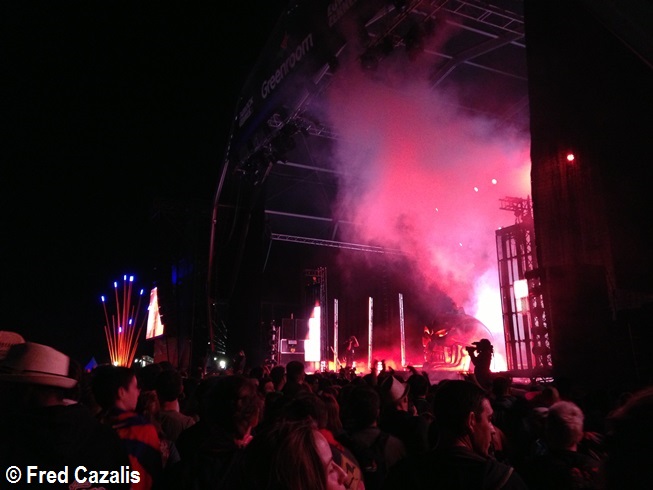 Difficile de rater le concert d'une des têtes d'affiche de cette édition 2013 des Eurockéennes : Jamiroquai est un groupe de référence depuis les années 1990 et sa réputation draine toujours les foules. Pourtant, on a fait le choix de quitter rapidement la Grande Scène pour aller voir ce que donneraient les allumés de Major Lazer sur La Plage, et on n'a donc pas vu suffisamment de ce concert pour être en mesure de le noter. Toujours est-il qu'on est assez séduit par une mise en scène sobre, composée essentiellement d'un écran géant en fond, qui fait apparaître les 11 musiciens en ombres chinoises, seul Jay Kay bénéficiant d'une poursuite sur lui. L'ensemble de la prestation est extrêmement classe, bien qu'un peu répétitive. On reste fasciné par la qualité des arrangements de celui qui est un des grands maîtres du groove depuis vingt ans. On décide finalement de s'en aller après l'immense Virtual Insanity, qui intervient aux environs de la vingtième minute de concert.