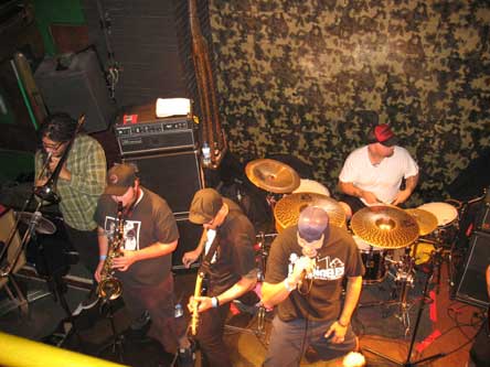 Wow, six personnes sur la scène du Café Julien, on peut dire que les Voodoo Glow Skulls savent exploiter au mieux un espace, vu que sur l'ensemble d'effectif, trois sont de beaux bébés taquinant allègrement le quintal, un joue du trombone à coulisse... Le chanteur débarque avec un masque de catcheur d'époque, et nous voici partis pour un set tout en rythme, le Ska se mélange superbement à un rythme Hardcore bien incisif, le public tout entier danse et bouge de la tête, tandis que devant la scène c'est un pogo bien vivant qui démarre pour ne plus s'arrêter, slams en bonus...