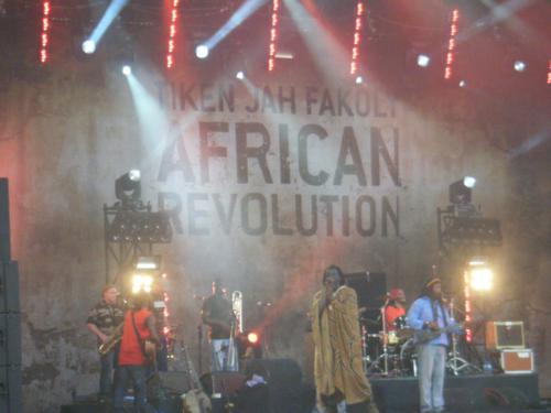 Plus que sa musique, on est assez curieux de découvrir le charisme espéré de Tiken Jah Fakoly, dont on s'est enfin décidé à chroniquer la très convaincant et combattif African Revolution. Il débarque en habit de griot, flanqué de délicieuses choristes et avec un vrai big band reggae de 9 musiciens, devant un public encore clairsemé. Pas tout à fait passionnés, on reconnait avec plaisir ses airs militants (dont certains lui ont attiré pas mal d'emmerdes en Afrique) comme Sors de ma Télé, Mon pays va mal, le nouveau African Revolution (un peu trop jamaïcain), et un très réussi Il faut se lever !. Un bon moment, mais qui ne nous a pas fascinés non plus...
