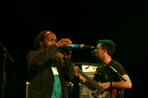 Le saxophoniste (de Cote d'Ivoire) nous invite à nous joindre à eux. Le groupe est rodé pour faire monter la sauce avant l'arrivée du chanteur. Et puis, un peu comme dans beaucoup de shows à la jamaïcaine, on demande au public d'acclamer la star. Ainsi le saxo nous fera scander le nom du chanteur. Il arrivera enfin. Et là, c'est le show qui commence.