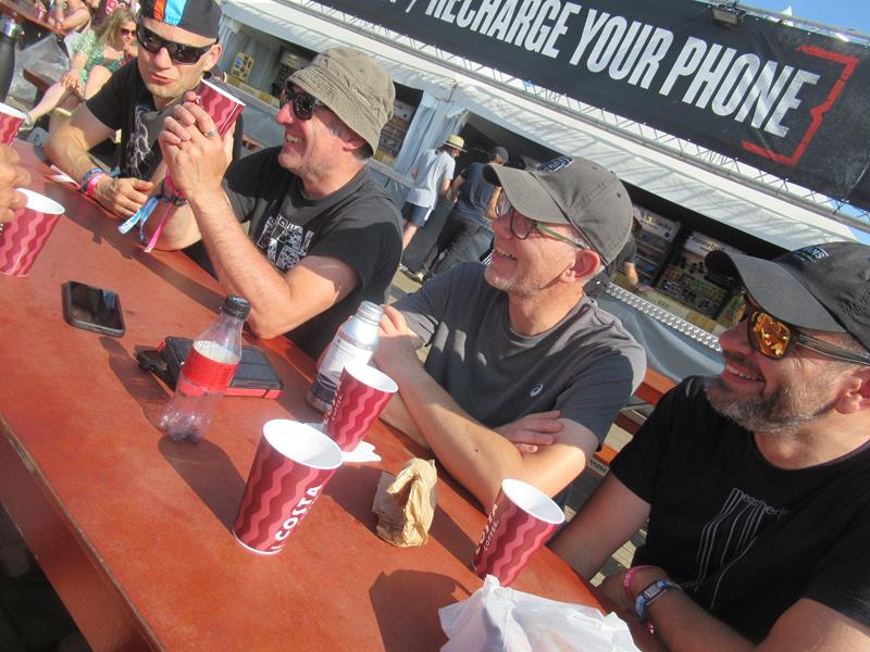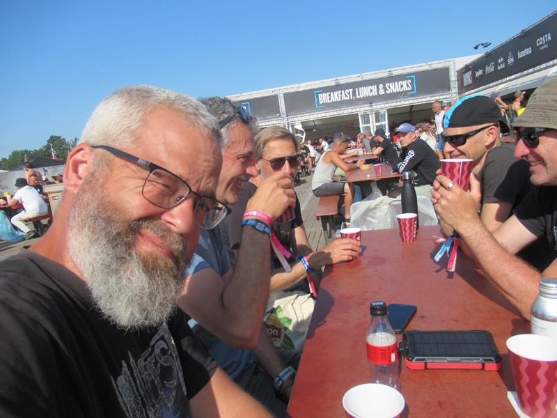 Après les files réglementaires au réveil (toilettes et douches), notre deuxième journée au "Gwaspopmaitholmeeting" commence agréablement autour de la terrasse et des tentes spécial petit-déjeuner, parfaitement situées juste à la sortie du camping Boneyard. Alors oui, c'est sûr, les gens en bandes mieux organisées (qui arrivent avec un char d'une demi-tonne, poussé et tiré à 4) n'ont pas besoin de ça : ils ont généralement au milieu de leur campement un barnum bardé de drapeaux, des chaises et une table pliante, un réchaud, huit kilos de café en poudre et assez de couques, de chips et de cartons de Maes pour tenir 4 jours : respect ! (saurez-vous trouver le terme wallon habilement glissé dans cette phrase ?)