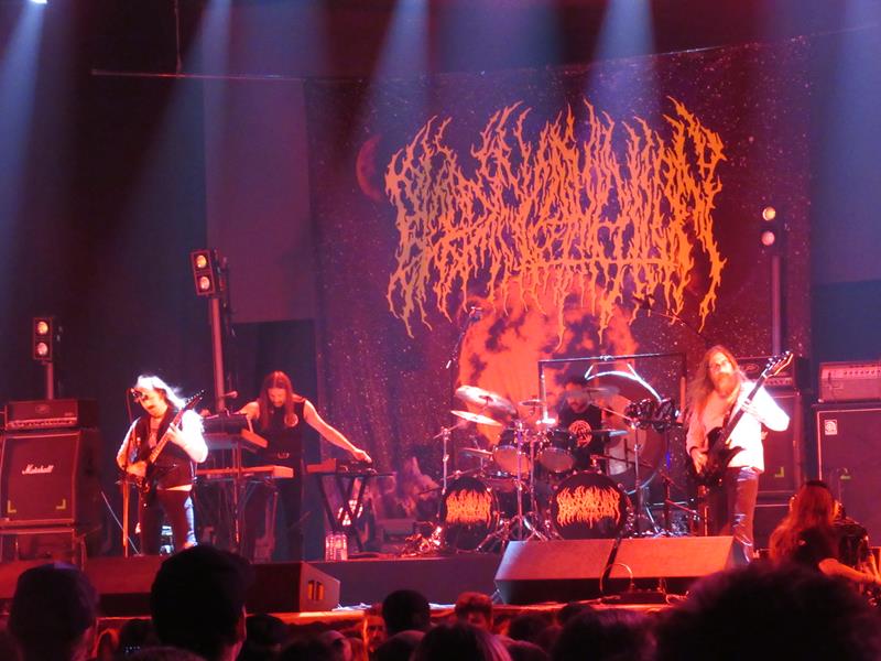 C'est vraiment pour faire plaisir à un ami pas venu avec nous (généralement de bon conseil), qu'on va voir Blood Incantation. Comme l'indique leur logo, rigoureusement illisible, c'est du brutal, du death qui ne rigole pas (double caisse, hurlement, peu mélodique), mais curieusement entrecoupé de passages floydiens, prog, voire un peu jazzy. Ca n'est pas tout le temps beau ni musical, beaucoup nous laissent aussi de marbre et ça manque sérieusement de liant avec les parties d'outre-tombe... Et puis oui, je sais, on avait dit pas le physique, mais difficile de ne pas sourire devant le combo cheveux longs / front dégarni / moustaches de leur leader, en ajoutant qu'une mini-obélisque un peu ridicule donne un côté Spinal Tap assez regrettable au show. Original certes, mais quand même très bizarre : pas convaincus, cher ami.