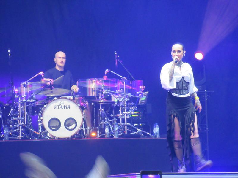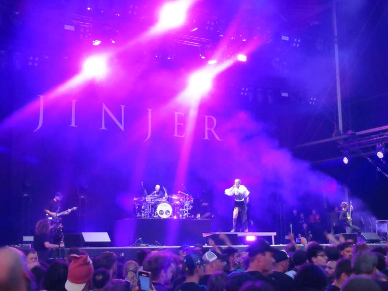 On a donc bien mérité d'aller voir un concert qui soit à la fois metal, sexy, et musicalement accessible et fun : le moment idéal pour revoir les Ukrainiens de Jinjer en somme, qui nous avaient fait fort impression par l'intelligence de leur propos, l'année de l'invasion de leur pays. Revoir aussi et surtout la belle Tatiana Schmayluk, dans sa belle tenue (sans doute traditionnelle), quelle dégaine stylée ! Elle dont le growl ferait rétrécir, dit-on, les roupettes de Poutine de peur à chaque fois qu'il l'entend, par delà le Dniepr. A quand une attaque du Kremlin par des drones musicaux ? On remarque juste qu'il n'y a pas d'écran sur la jolie scène Jupiler, mais tant pis : il n'y a plus qu'à s'approcher pour la voir, et justement ce n'est pas si difficile sur cette superbe zone annexe du Graspop !