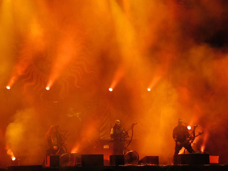 Ce n'est pas parce qu'on est bien fatigué qu'on ne va pas honorer notre deuxième rencontre, très attendue, avec les polonais de Behemoth, qu'on avait vraiment kiffé au Hellfest, d'autant qu'ils ont cette fois les honneurs d'une grande scène en prime time - la nuit est à eux, et ils vont y produire un show magistral, réaffirmant s'il le fallait leur place dans le gotha du black metal. On est donc pas resté longtemps assis dans l'herbe, car la lumière de leur ténèbres oranges nous a attiré vers leur riffs morbides comme une phalène ensorcelée... Voilà des gens qui font effectivement un peu peur, avec leurs gueules de déterrés blanchâtres, les yeux injectés de sang : The Shit ov God ! Sans pour autant avoir à insister lourdement sur une imagerie satanique, qui s'avère souvent grand-guignolesque chez d'autres.