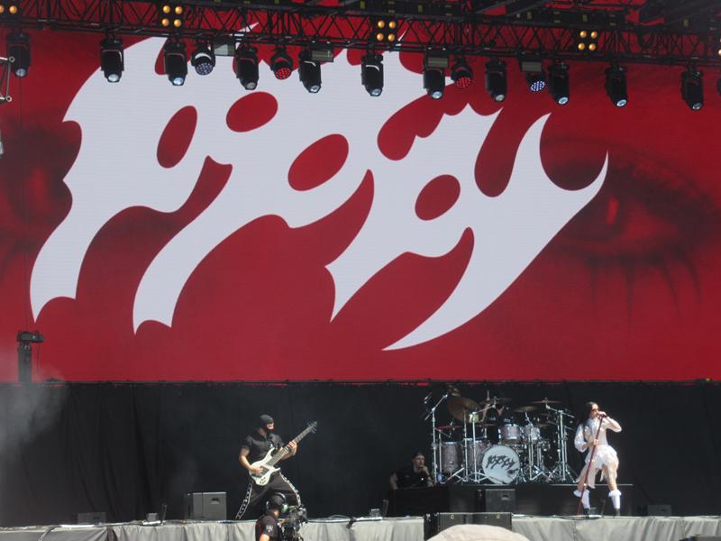 A être sur les mainstages, on donne aussi sa chance à Poppy, très gros logo pour une petite demoiselle dans sa fort jolie tenue, dans le genre pop metal (metalcore ?) à la mode depuis quelques années. Belle diction mais une voix très variète, un peu trop maniérée pour nous (sauf quand elle hurle bien sûr, et il faut avouer qu'elle hurle plutôt bien aussi). C'est quand même assez mainstream et très référencé, on dirait souvent Madonna en version metal. Est-ce bien raisonnable ? Comme le soleil nous tape fort sur la couenne, on passera de toutes façons ce créneau à faire la queue pour de l'eau (le petit fail d'organisation du festival : les canons à eau brumisateurs ne sont vraiment pas suffisants !). Après une longue attente, chacun.e veut donc mouiller tous ses habits, remplir sa bouteille, boire un ou deux verres... et ça prend un temps infini ! Un passage au toujours très agréable Beer & Stories permettra de s'en remettre et de retrouver nos amis.