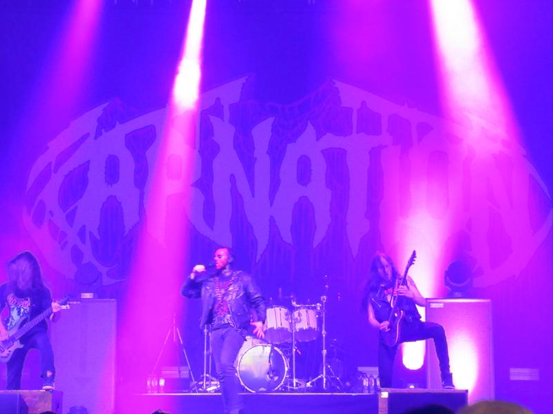 Retour aux sources avec Carnation, du death metal d'origine belge, bien dans le genre 100 % orthodoxe, avec gueule sanguinolente mais uniquement du chanteur sauf erreur (dommage, contraire aux standards ! (If anybody wears a suit on stage, the whole band does !). Voix 100 % growl, double pédale et batteur à 3 ou 4 bras : prend ça dans ta gueule ! De mémoire, pas la grande foule à cette heure-là, mais quand même assez pour faire le circle pit réglementaire sous la tente Marquee, pour les plus motivés. Qui dit orthodoxe dit aussi peu varié, et on est vite fatigué par le son, trop fort et donc un peu confus, une fois de plus quand on est trop à l'avant sous cette tente (à notre goût). On en profite donc pour aller faire un petit temps calme, et roupiller quelques instants à l'ombre. Un petit reset, quoi de mieux pour reprendre pied ? La journée ne fait que commencer...