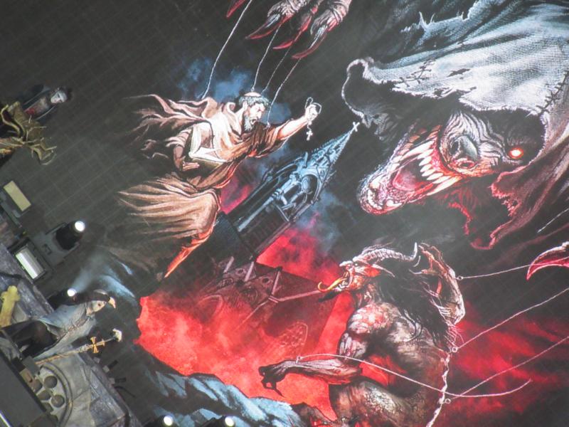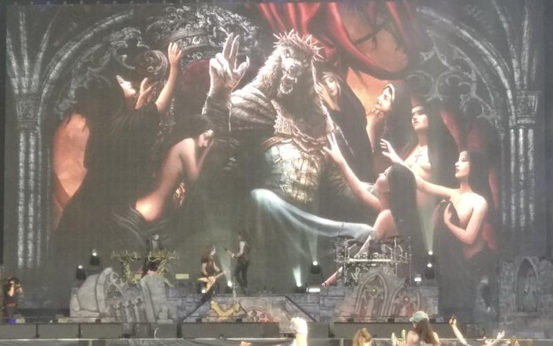 On pensait juste, non sans une certaine vilénie, aller se placer stratégiquement sur la scène jumelle, bien avant la grosse tête d'affiche du jour. Mais en fait nous attend là une belle surprise : les très distrayants allemands de Powerwolf, sortes de chaînons manquants entre Rammstein, Ghost et ... Iron Maiden justement. Leur délire soutanes et maquillages, leurs images grandiloquentes de héros en forme de loup bodybuildé sont assez drôles - à ce stade on est bien au delà du kitsch, avec du powermetal sous inspiration latine et wagnérienne ! On est d'abord gêné par le côté ouvertement bigot et les croix partout (second degré ?), avant finalement de s'en accommoder - à chacun ses fantasmes après-tout, alors si le leur est de se rouler sur une peau de bête avec des nonnes sexy, hein, qui sommes-nous pour les envoyer au ciel ou en enfer ?