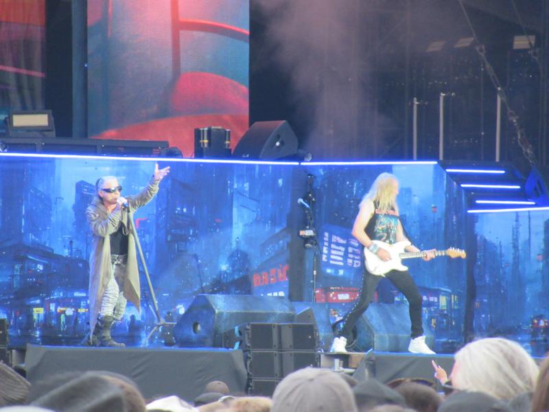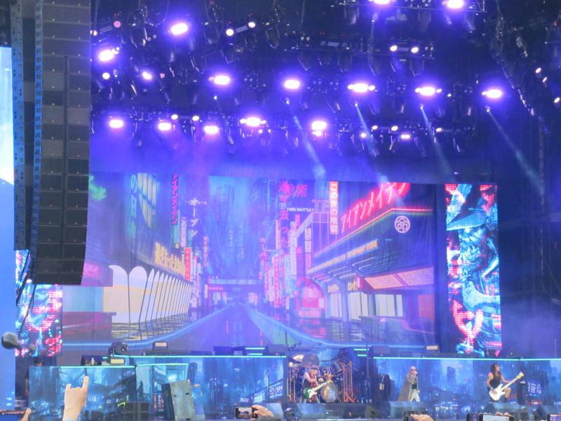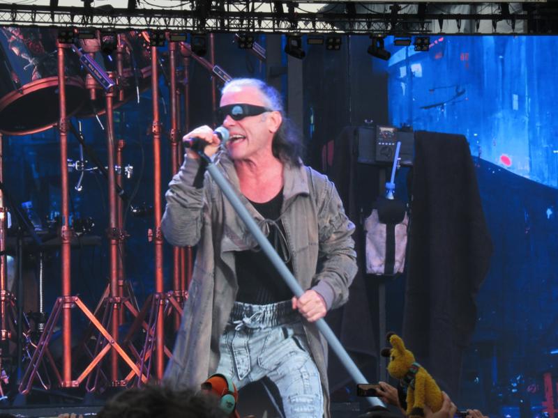 Et justement, les suivants, pourtant mega-groupe de live, dont on attendait sans doute trop, vont nous décevoir en comparaison. Iron Maiden, qu'on écoute rarement mais dont le show nous avait ébloui ici-même en 2018, va cette fois nous laisser quasiment de marbre. Oh, visuellement on y est pourtant, certes les mecs n'ont pas pris une ride et Bruce Dickinson n'a pas pris une taille de fute en 5 ans. Par contre, côté scénographie, c'est tout tristounet et ça semble d'autant plus vide que la scène est immense : où sont les mots vibrants de Churchill ("We shall never surrender !"), l'avion entier vrombissant sur scène, la mega-mascotte gonflable d'Eddie, le Trooper de 3 mètres de haut, etc. etc. ?