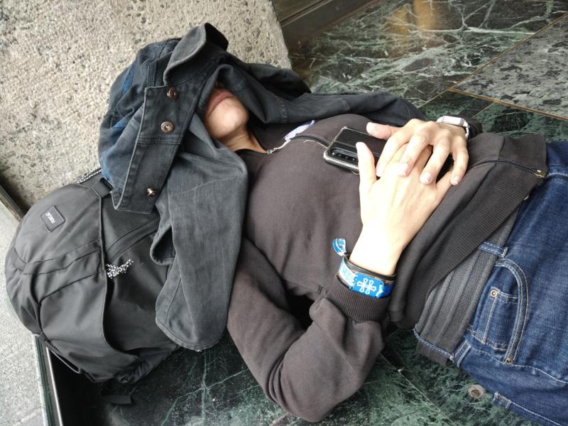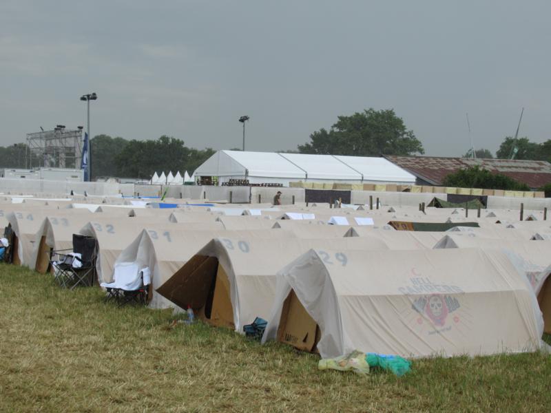 On dépose alors les armes pendant un bon créneau pour aller reposer nos couennes usées : pour faire la sieste, quel meilleur endroit que le camping, à la fraîche ? D'autant plus fraîche d'ailleurs qu'une courte averse nous permettra même d'y essayer nos capes de pluie ! On note avec une certaine inquiétude que des mains, certes rapides et pleines de sollicitude, ont couvert depuis ce matin toutes les Kartent de plastique, agrafé aux 4 coins... Auraient-ils finalement un doute sur la résistance à de la vraie pluie de nos habitats temporaires ? De quoi instiller un doute, en tout cas, qui ne nous empêchera pas de faire un bon pénéquet, une fois l'averse passée, à l'ombre d'un barnum aimablement prévu à cet effet par les tauliers du Easycamp... En revenant on aperçoit la fin des caricaturaux Beasts in Black, du power metal scandinave (on l'aurait parié), très souriants et sympas, cela dit.