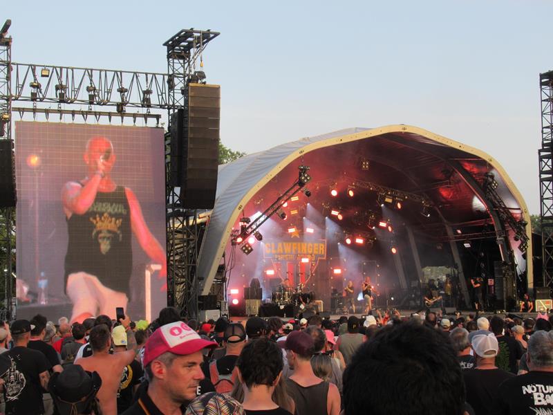 Car on est plutôt allé rendre visite à un vieil amour de jeunesse en Warzone, les suédois de Clawfinger (qui ont pris 30 ans dans la gueule, comme nous, coup de vieux !), "rap metal since 1993", dit leur banderole ? Eh bien ça groove plus que Momo, même s'il n'y a pas la grande foule ! Ici le son est précis et énergique, le leader charismatique et cool, et ils affichent même en bonus un peu d'autodérision, façon Toy Dollz. Très bon moment, je me résous hélas à l'idée qu'ils ne vont pas faire "mon" titre... quand tout à la fin il retentit : la voix enfantine qui ouvre en comptine le mythique Do as I say, n'est pas loin de me foutre les poils ! Rhaââ, merci les gars, j'ai perdu 30 ans pendant 5 minutes, et pu poster la petite vidéo qui va bien à l'attention de mes amis de cette époque (... et qui sont toujours des amis) ! Assurément ma madeleine de Proust du week-end.