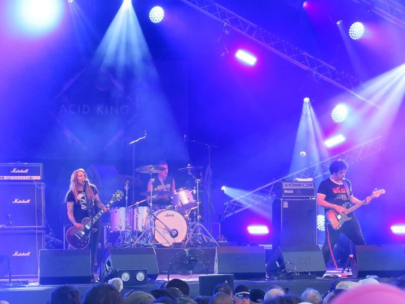 Oui, désolé, on a encore parlé des gogues du camping : fallait pas nous inviter ! Mais hey, des toilettes sèches pour 40 000 personnes, ça nous impressionne toujours encore... Place à la musique ! Après une première collation/bière bien méritée, enfin arrivé à 18 heures, on pensait pouvoir choper Planet of Zeus (stoner + grec = intrigant !) mais ils ont switché avec Gaupa, toujours stoner mais suédois et assez calme - au moins on commence sans être agressé. Mais bof, pas passionnant a priori, on va donc saluer une première fois la superbe Gardienne des Ténèbres encore endormie, ainsi que le plastron et l'air renfrogné de notre regretté Lemmy. Joli couple infernal en somme... La fin du concert est un peu plus intéressante, avec une guitare acide qui donne finalement une belle tonalité psyché.