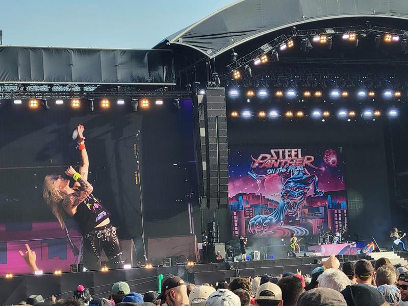 Content de revoir les Steel Panther, cette bande d'obsédés sexuels qui nous avaient tant amusés en 2022, ces joyeux crétins adeptes de hair metal, de body building et de pantalons en spandex, résolument bloqués en 1987, c'est marqué dessus le chanteur ("La meilleure année de l'histoire du rock, celle de Appetite for Destruction" !). Avec leur inénarrable playboy peroxydé, chainon manquant entre Guns'n'Roses et Mötley Crüe, et dont la grande passion est les pussies ("J'aime les chattes !", en V.O...). Le second degré est toutefois clairement établi et leurs pitreries sont toujours marrantes, quoi qu'un peu trop cul-cul - 10 minutes ne sont pas passées qu'il y a déjà 50 filles plus ou moins dénudées sur scène. Les paroles voleront toujours à la même hauteur, sous la ceinture donc, parlant un coup de Asian hooker, un coup de Glory hole...