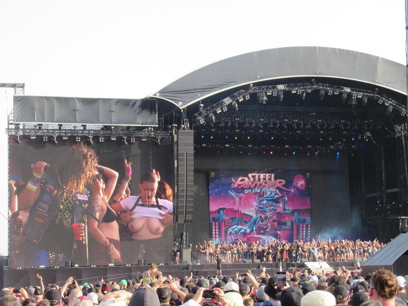 A commencer par ces filles qui s'exhibent toujours complaisamment sur la mainstage, quand elles ne roulent pas carrément des pelles au chanteur qui, se moque le guitariste, pourrait être leur père puisqu'il a paraît-il 70 ans ! Comme il n'est jamais trop tard, ce dernier vient manifestement de découvrir le mot "nichons" et en fait un grand usage, notamment pour exiger la "world record wave of nichons" ! Bon allez passons, on a encore ri et musicalement ça tient assez bien la route, dans son style totalement kitsch et ringard. Par contre, pas d'imitation hilarante d'Ozzy cette fois, dommage...
