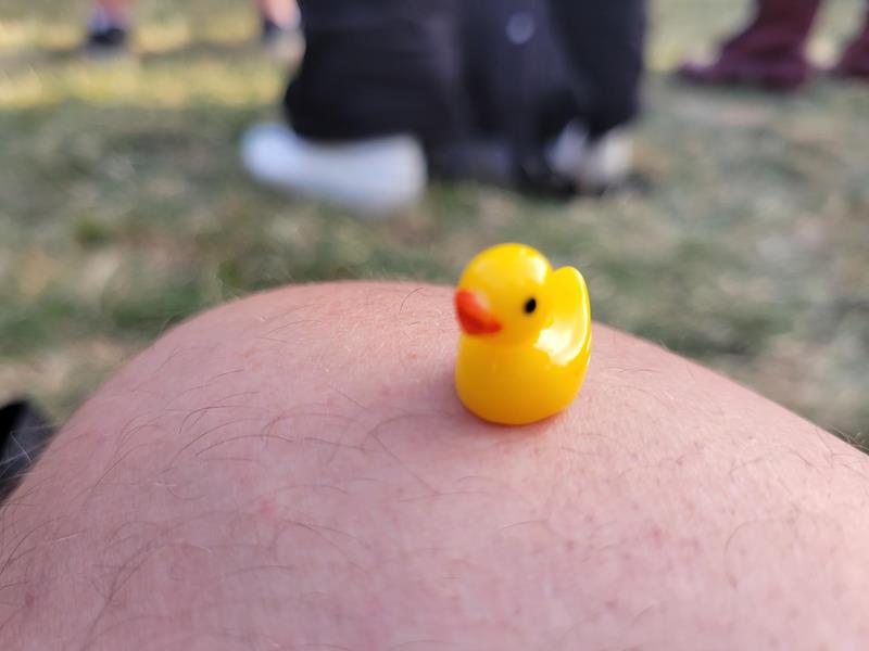 Plus étonnamment alors que je suis assis dans l'herbe à noter un truc, une fille aux cheveux roses (peut-être agacée par ce show un peu trop male gaze) me met une tape dans la tête en passant (pas trop forte), puis se confond en excuses, limite en larmes, et m'offre pour se faire pardonner un minuscule mais très joli petit canard en plastique, que je ne peux pas refuser. Allez comprendre... Je constate alors que les gens, comme elle peut-être, semblent globalement assez ivres quand même - et comment leur en vouloir en cette belle fin d'aprème ?