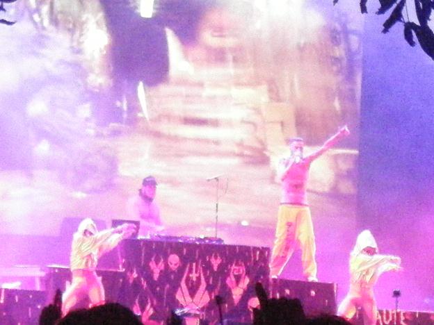 Difficile après ça de remettre directement le couvert pour les tout aussi énervés Die Antwoord, pourtant plutôt plaisants avec leur hip-hop white trash déluré, sexy (quel costumes !) et au final assez rigolo, aux voix ultra-trafiquées et au son-et-lumière convaincant. Une belle reprise électro de Pitbull/Terrier de Kusturica montre en tout cas sans ambiguité un solide sens de l'humour et du second degré... Dans le genre, une prestation bien plus classieuse et plus aboutie que les pitreries de nos atroces Kap Bambino / Sexy Sushi hexagonaux... mais qu'on doit quitter, sur pression amicale de nos amiEs, pour aller se placer pour la plus grosse tête d'affiche du jour.